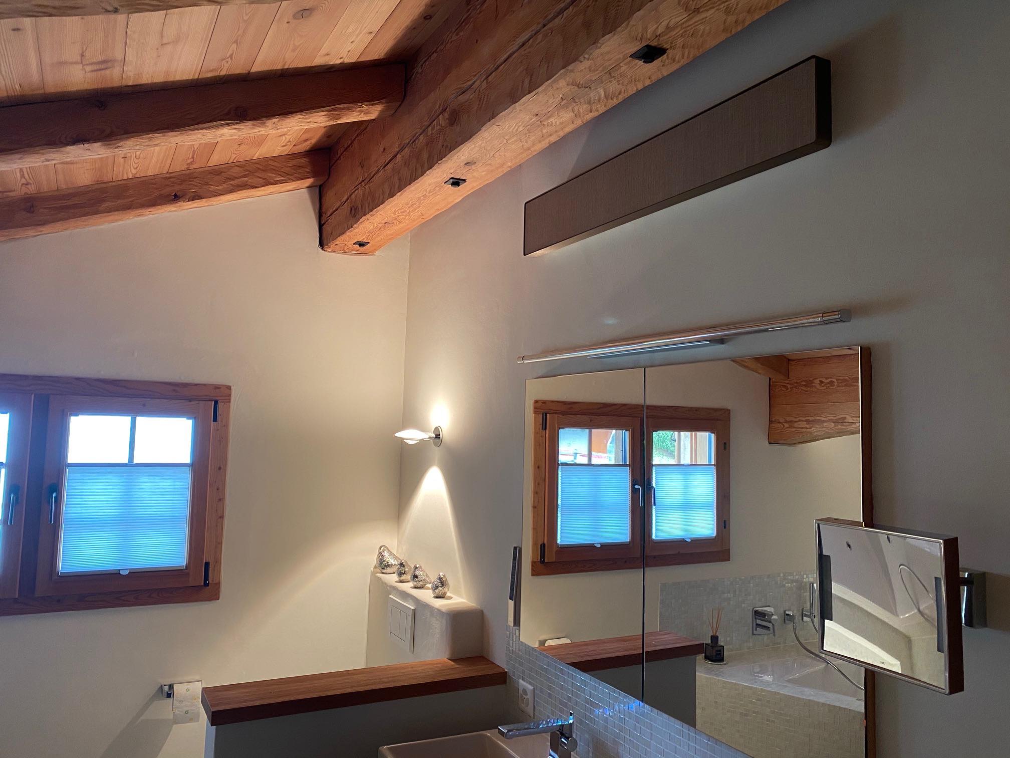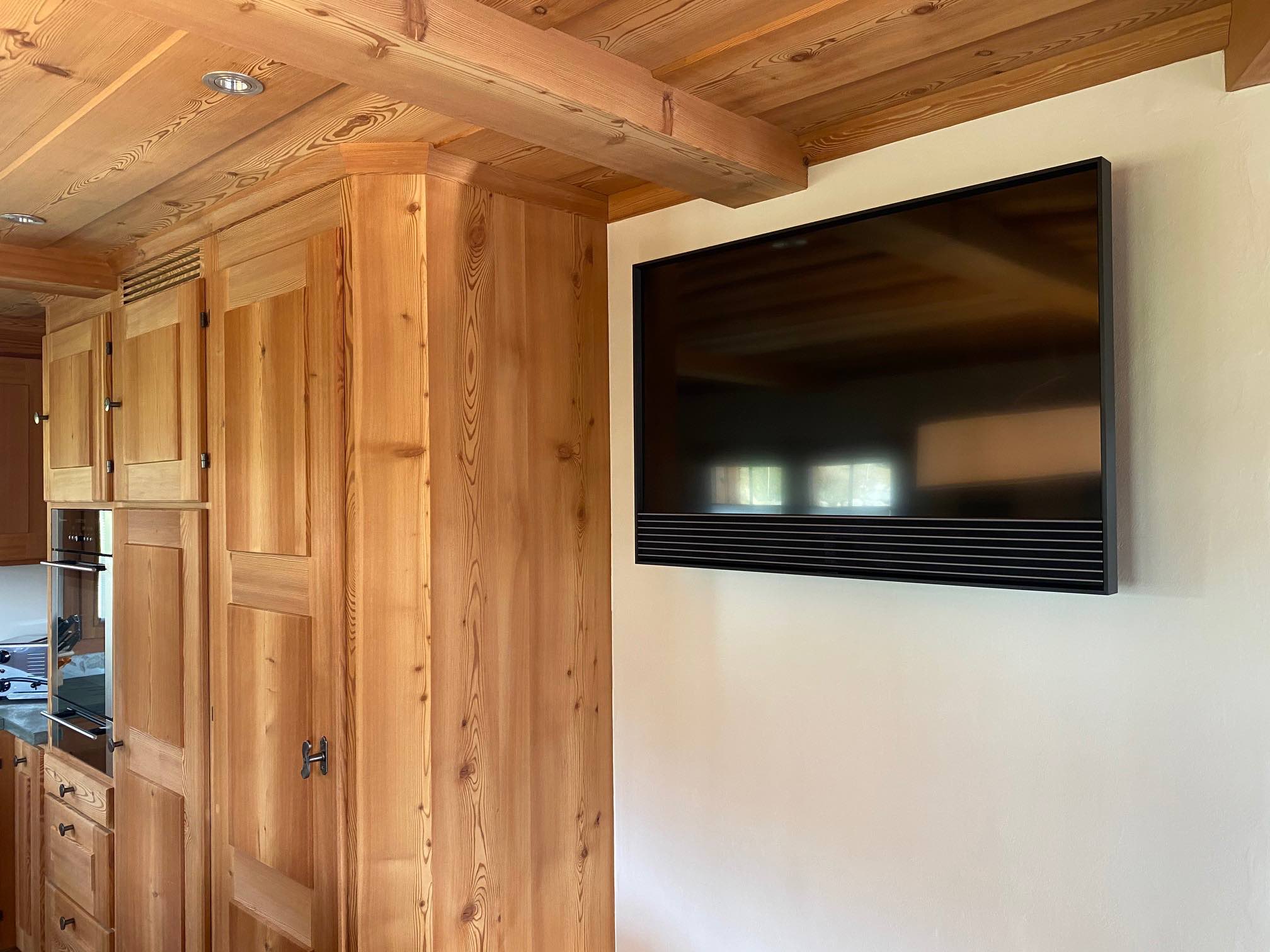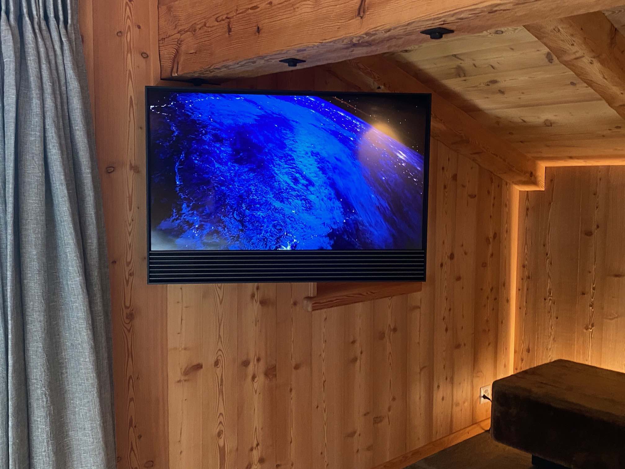 Bei der Renovation einer Ferienwohnung durften die Räumlichkeiten mit einer Audio- und Videoinstallation von Bang & Olufsen ausgestattet werden. Auf Knopfdruck oder per App-Bedienung können die Musiksysteme und die Fernsehgeräte gestartet werden. Die zwei Beosound Stage mit einem Alurahmen in der Farbe Bronze betten sich im Bad und auf der Terrasse perfekt in die warme Holzstruktur ein. Für ein flächendeckendes WLAN wurden mehrere Access-Point installiert und konfiguriert.