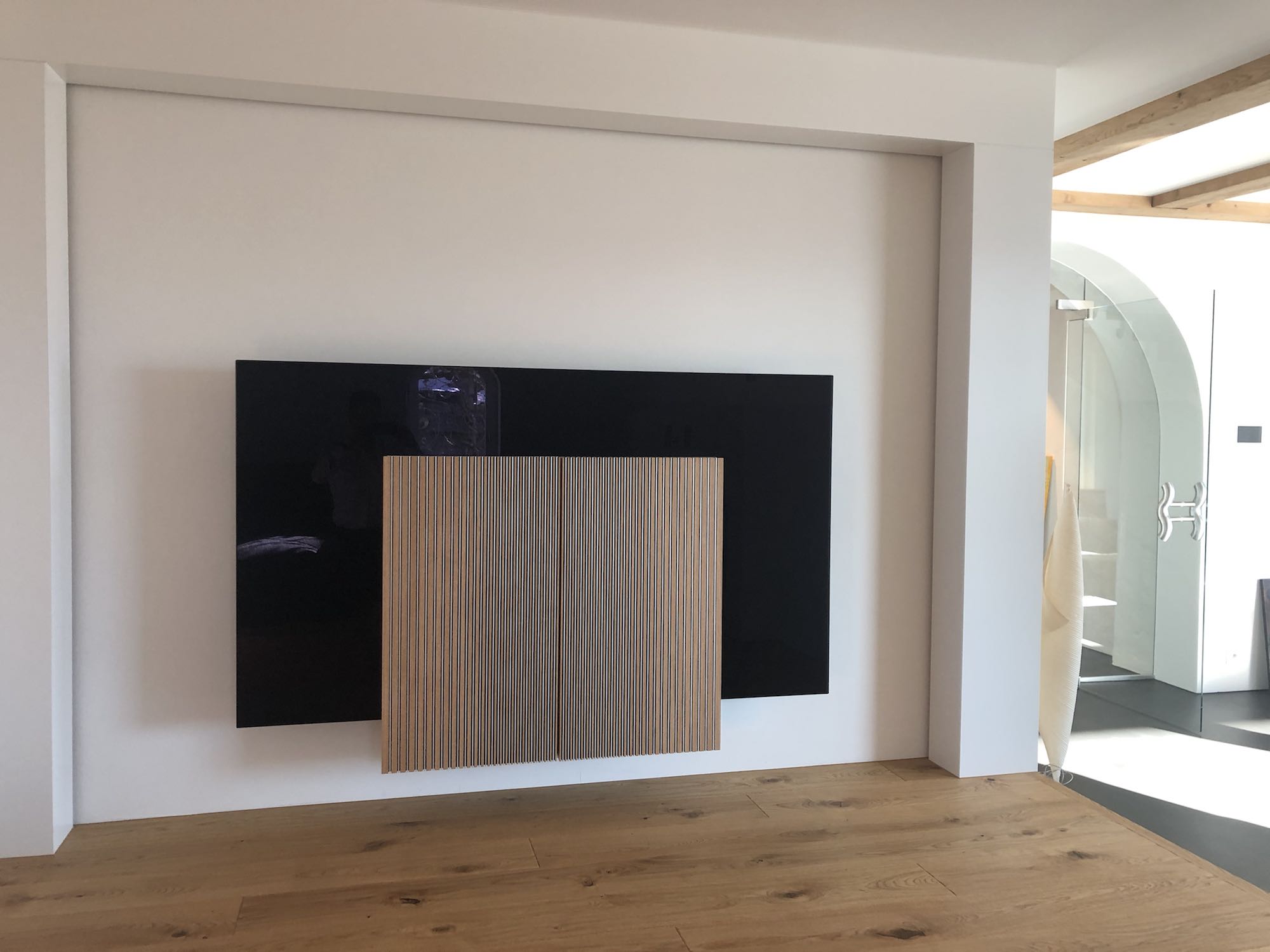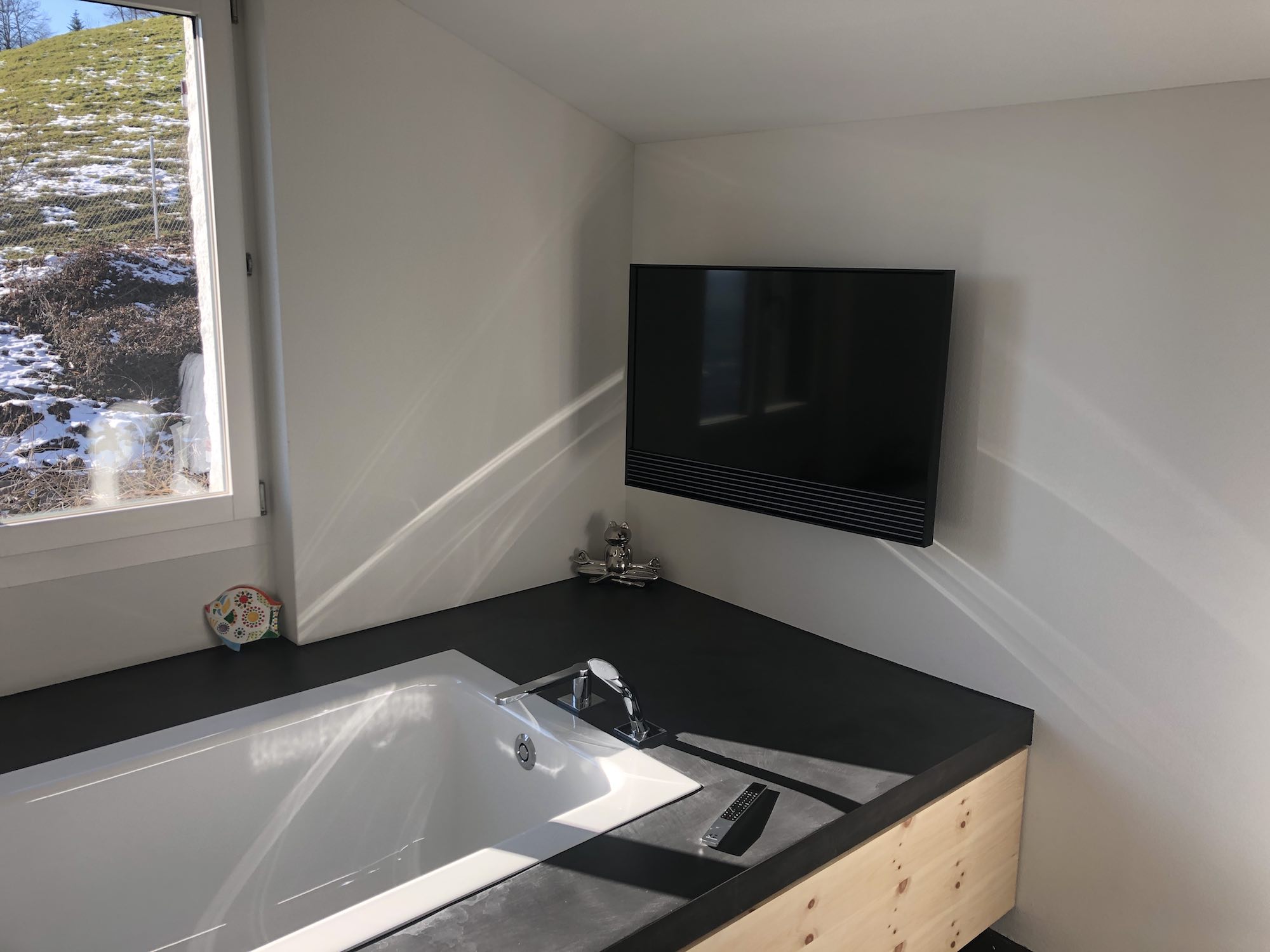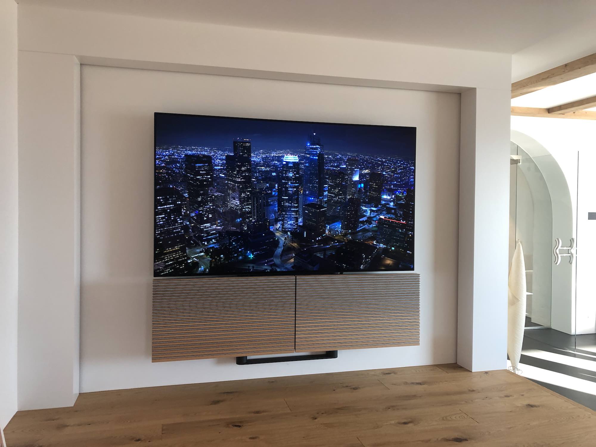 Im Wohzimmer sorgt ein Beovision Harmony 77" mit Beolab 16 als Rücklautsprecher und dem passenden Einbau-Subwoofer für ein tolles Kinoerlebnis. Im Ess- und Badezimmer wurde jeweils ein Beovision Horizon installiert. Dank zwei hochwertigen Einbaulautsprechern geniesst man satte Musik in der Küche.