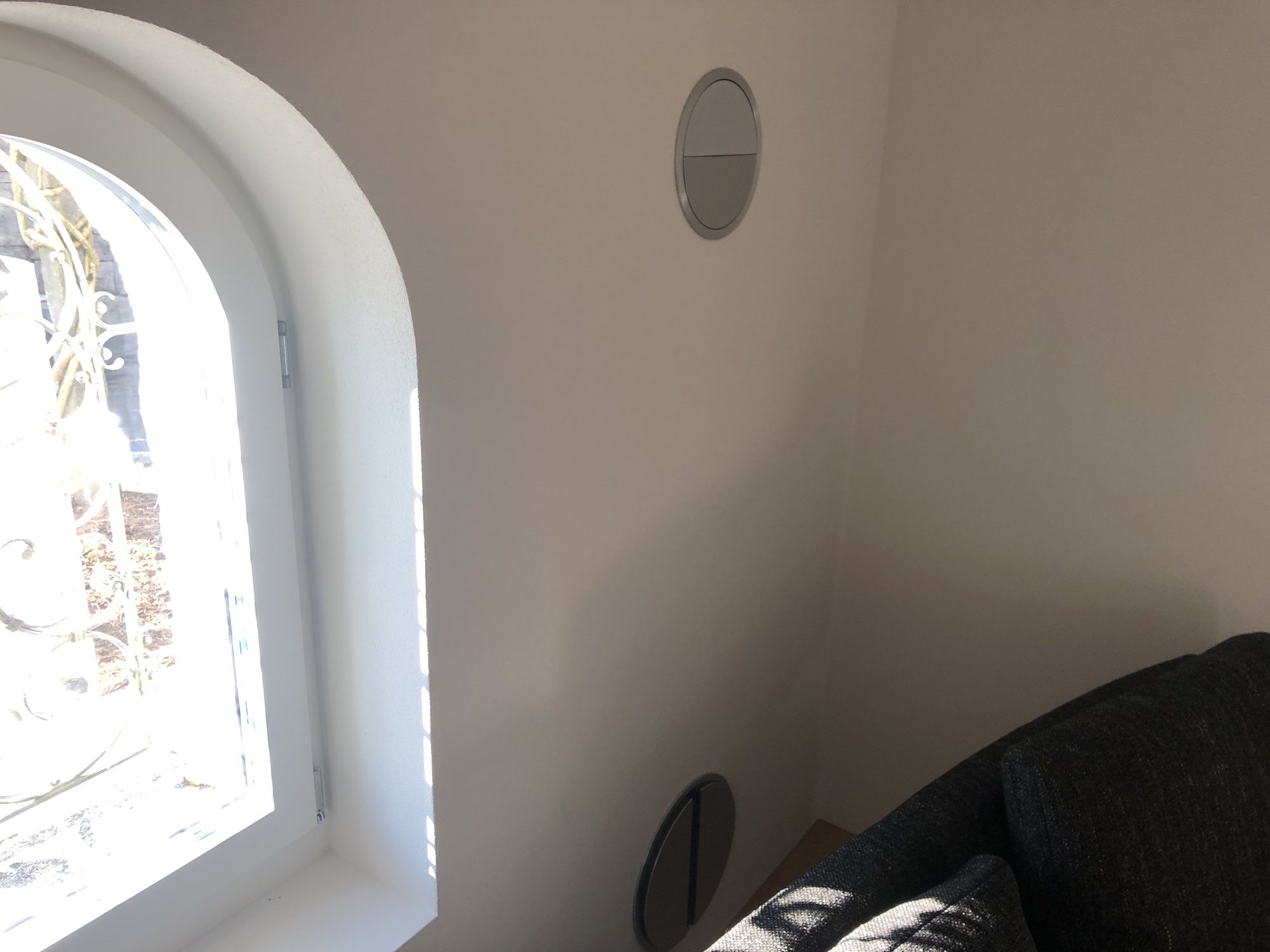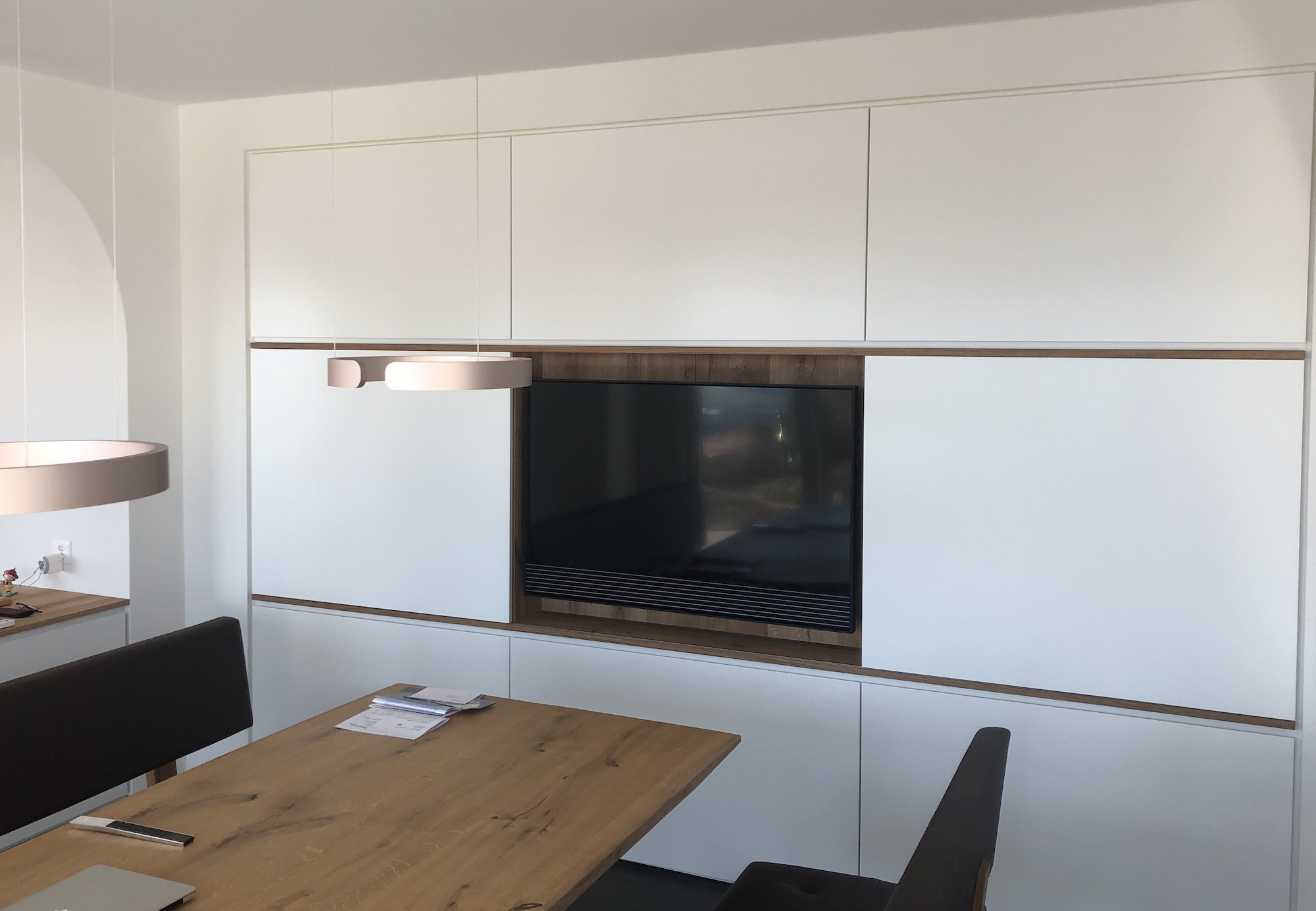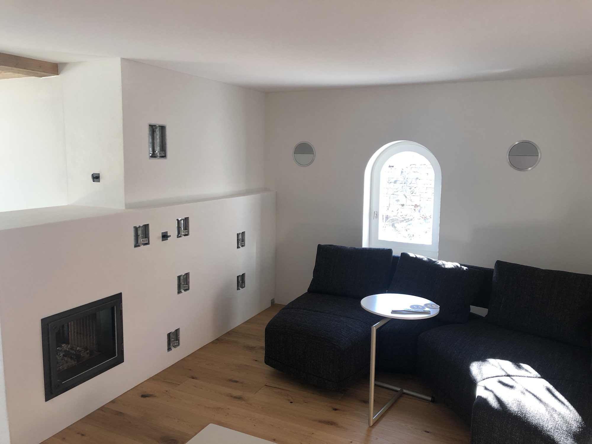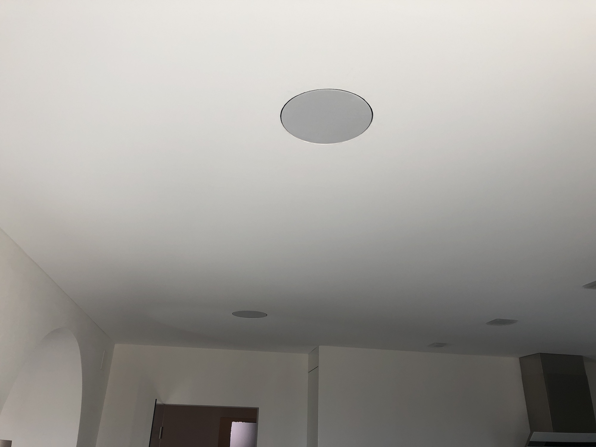 Im Wohzimmer sorgt ein Beovision Harmony 77" mit Beolab 16 als Rücklautsprecher und dem passenden Einbau-Subwoofer für ein tolles Kinoerlebnis. Im Ess- und Badezimmer wurde jeweils ein Beovision Horizon installiert. Dank zwei hochwertigen Einbaulautsprechern geniesst man satte Musik in der Küche.