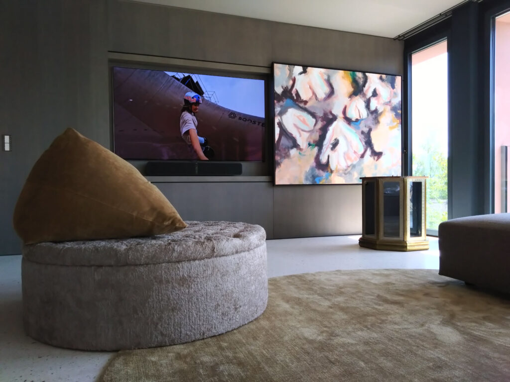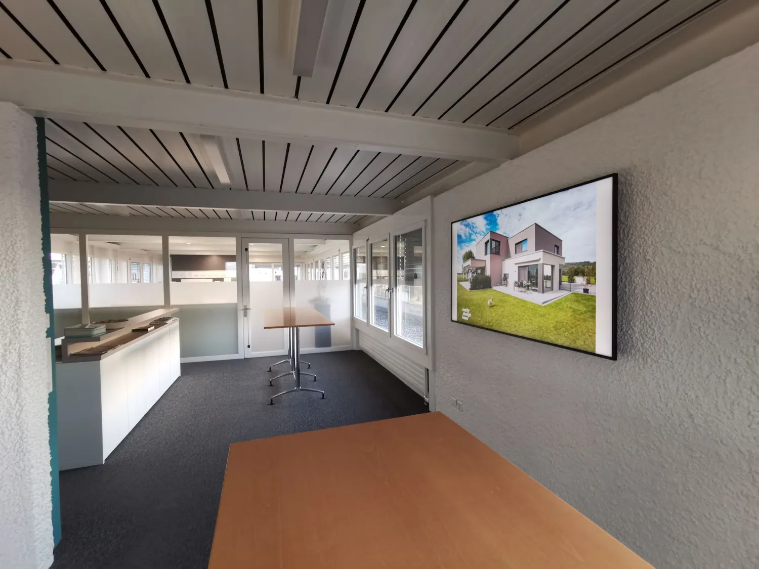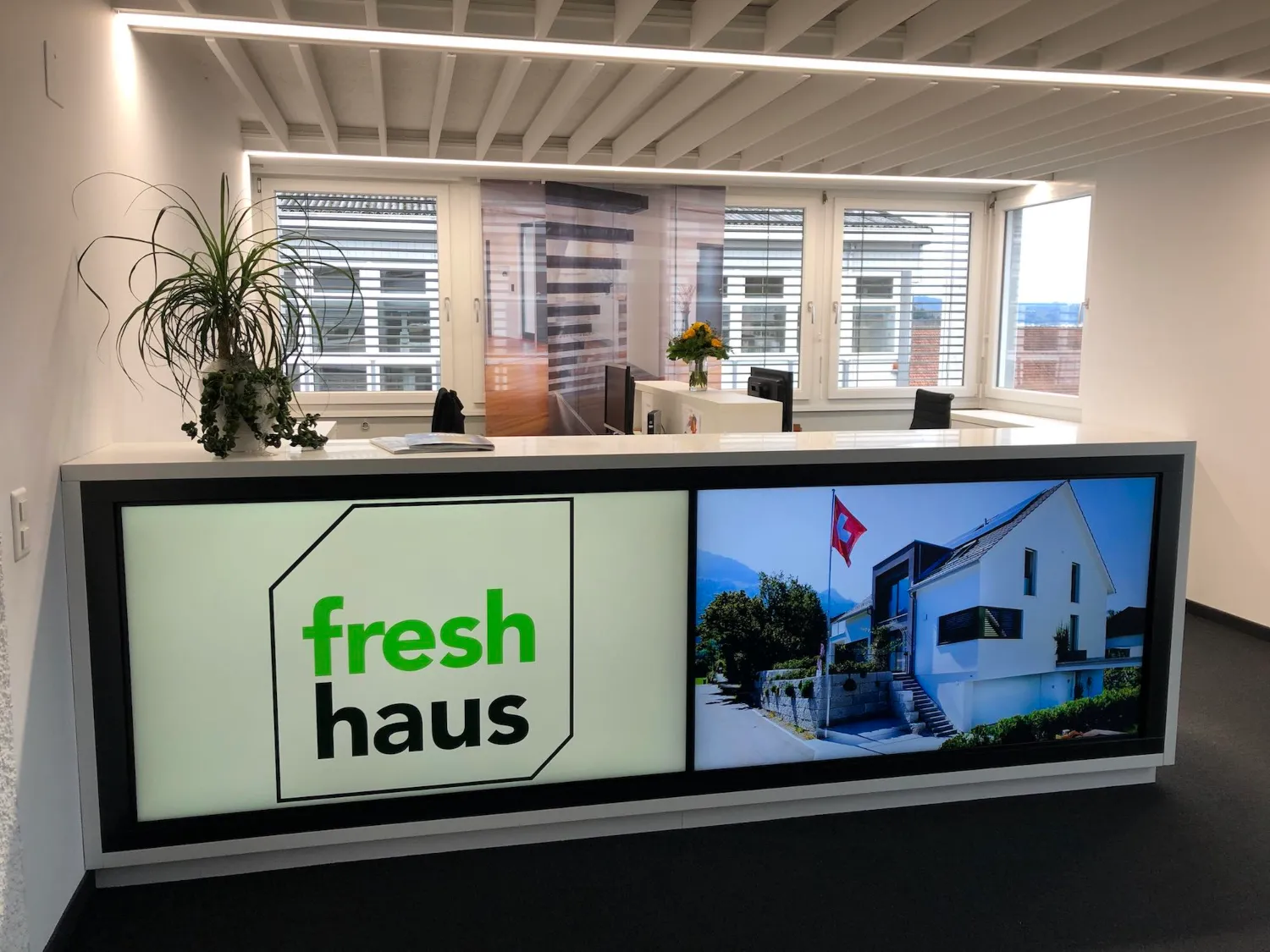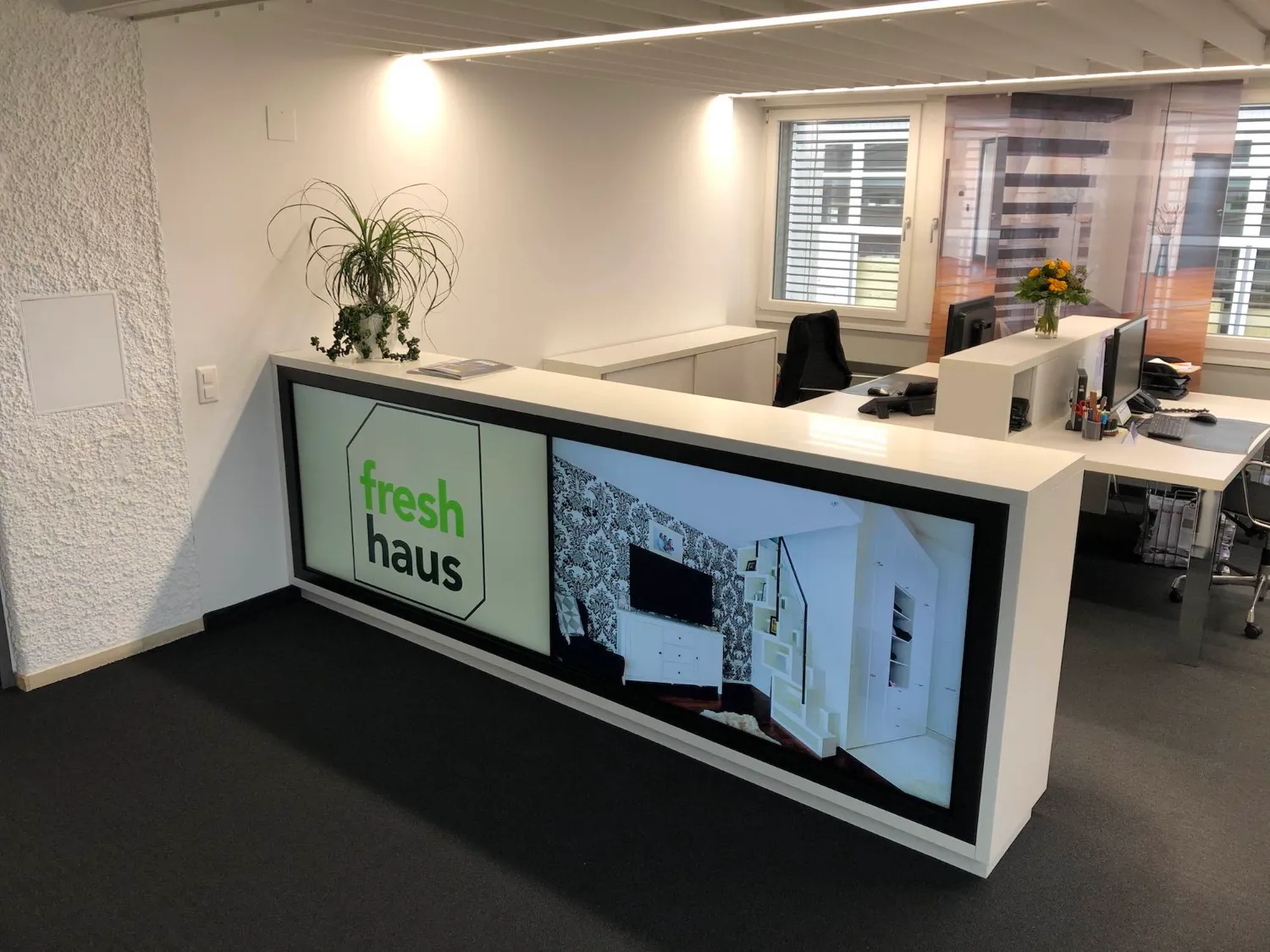 Zwei Profi-Display von Samsung wurden in die Empfangstheke eingebaut. Über eine webbasierte Oberfläche können Bilder und Inhalte autonom oder als eine gemeinsame grosse Anzeigefläche dargestellt werden. Für Werbeanzeigen sowie für Besprechungen wurde im Obergeschoss ein 75" Display mit derselben Oberfläche installiert.