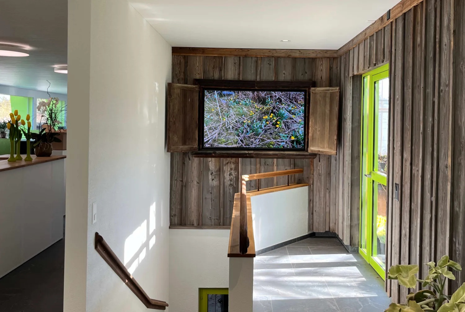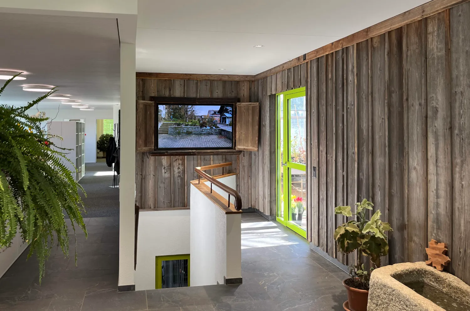 Beim Geschäftsumbau der Felix Gartenbau AG durften die Audio- und Videolösungen realisiert werden. In den Büroräumlichkeiten sorgen Sonos Lautsprecher für angenehme Hintergrundmusik und ein 55" Sony Display wird im offenen Meetingraum für effiziente Besprechungen genutzt. Als Hightlight ist ein 65" Sony Display im Eingangsbereich in ein Holzfenster eingelassen. Mit einem Digital Signage Player können Bilder- und Videoinhalte via einem Webbrowser ortsunabhängig und in Echtzeit neu aufgespielt werden.