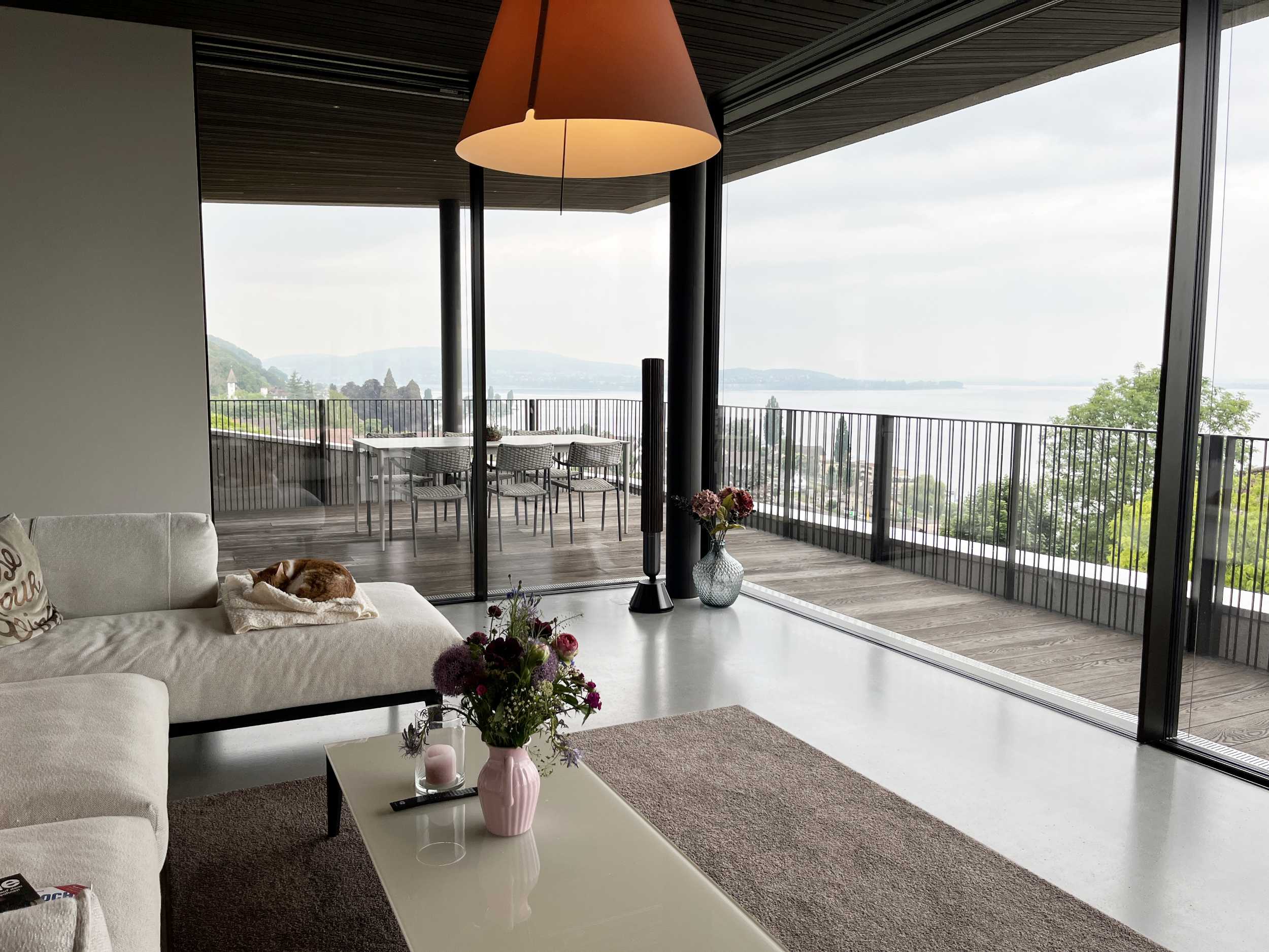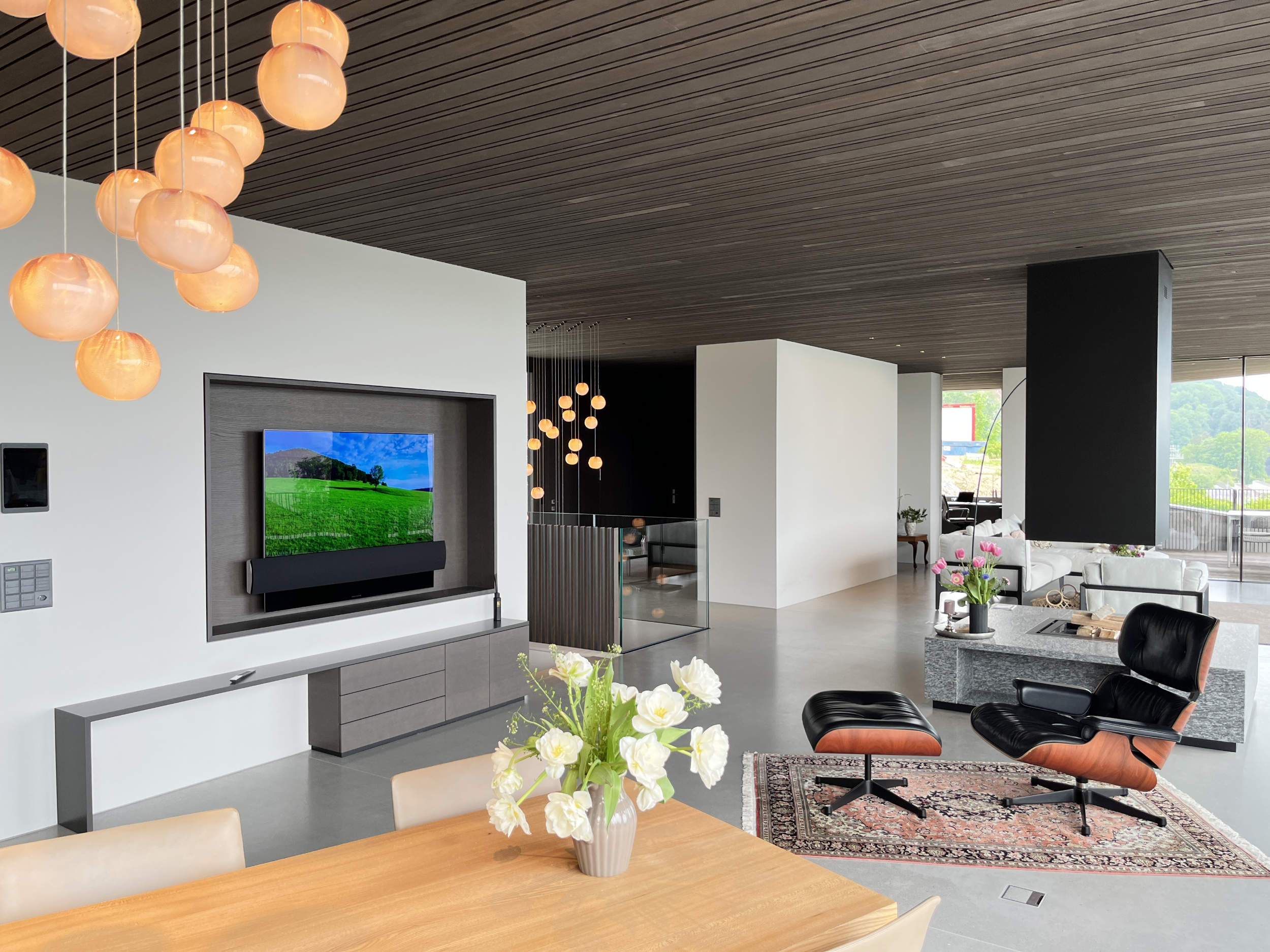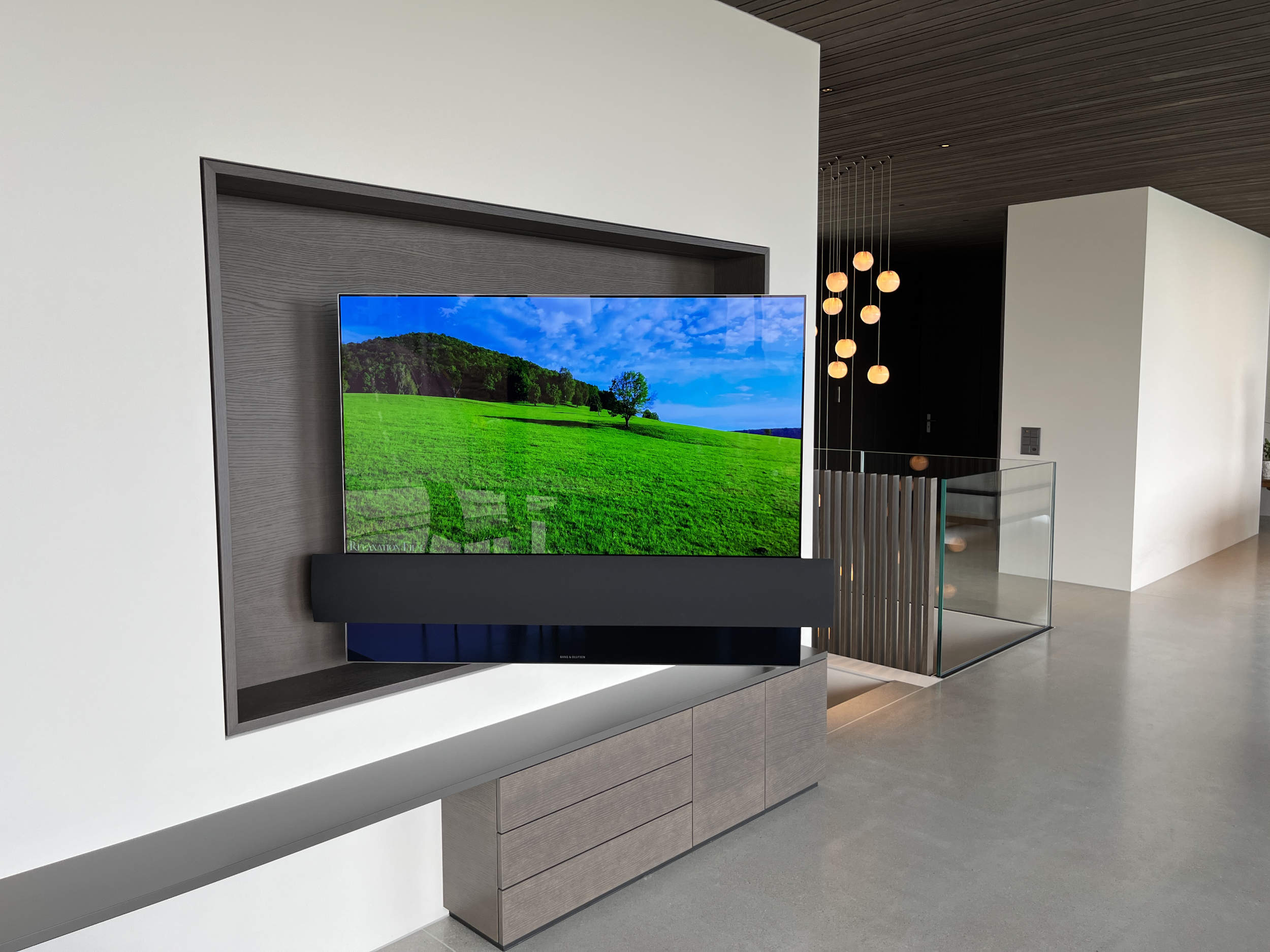 Für einen Hausneubau durfte das Audio- und Videosystem geplant und realisiert werden. Dank dem Beovision Eclipse und einer motorisierten Wandhalterung kann im Wohnzimmer vom Fernsehsessel oder vom Esstisch in einem angenehmen Winkel das TV-Programm verfolgt werden. Bei der Sofalandschaft mit wunderbarem Weitblick sorgen zwei Beolab 28 Lautsprecher für besten Musikgenuss. Ein LG Fernseher mit einer Beosound Stage im Fitness und mobile Beosound Level vervollständigen die Audio- und Videoinstallation. Diverse WLAN Access-Points und ein Controller im Technikraum ermöglichen ein flächendeckendes WLAN und eine übersichtliche Geräteverwaltung. 3,3m breiten Leinwand und einem individuell zusammengestellten 5.1 Surround Lautsprecher System. Ein einziger Tastendruck auf der Fernbedienung oder in der App lässt das gesamte Heimkino starten. Dank sorgfältiger Planung konnte der Beamer und die gesamte Technik in einem bestehenden Wandschrank nahezu unsichtbar installiert werden.